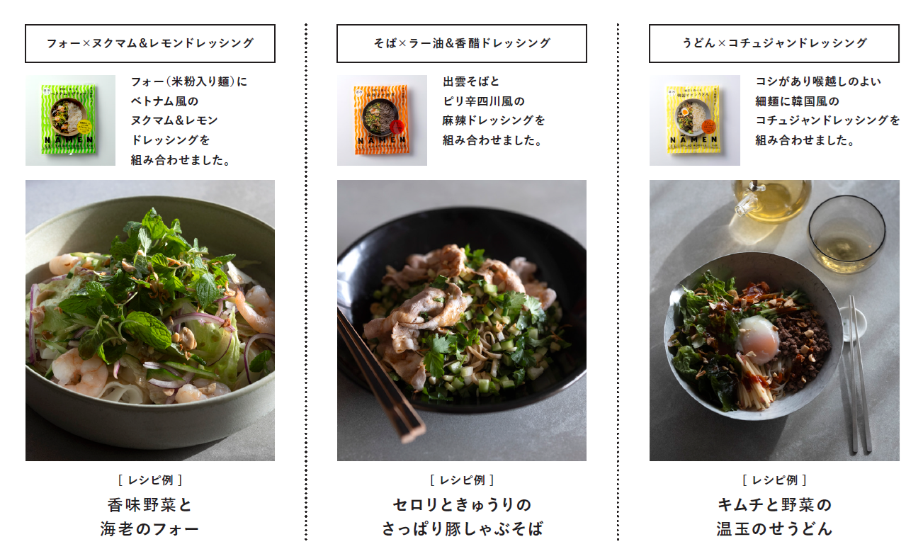 「NÃMEN」そば×ラー油&香醋ドレッシング風つゆ 「NÃMEN」うどん×コチュジャンドレッシング風つゆ 「NÃMEN」フォー×ヌクマム&レモンドレッシング風つゆ |