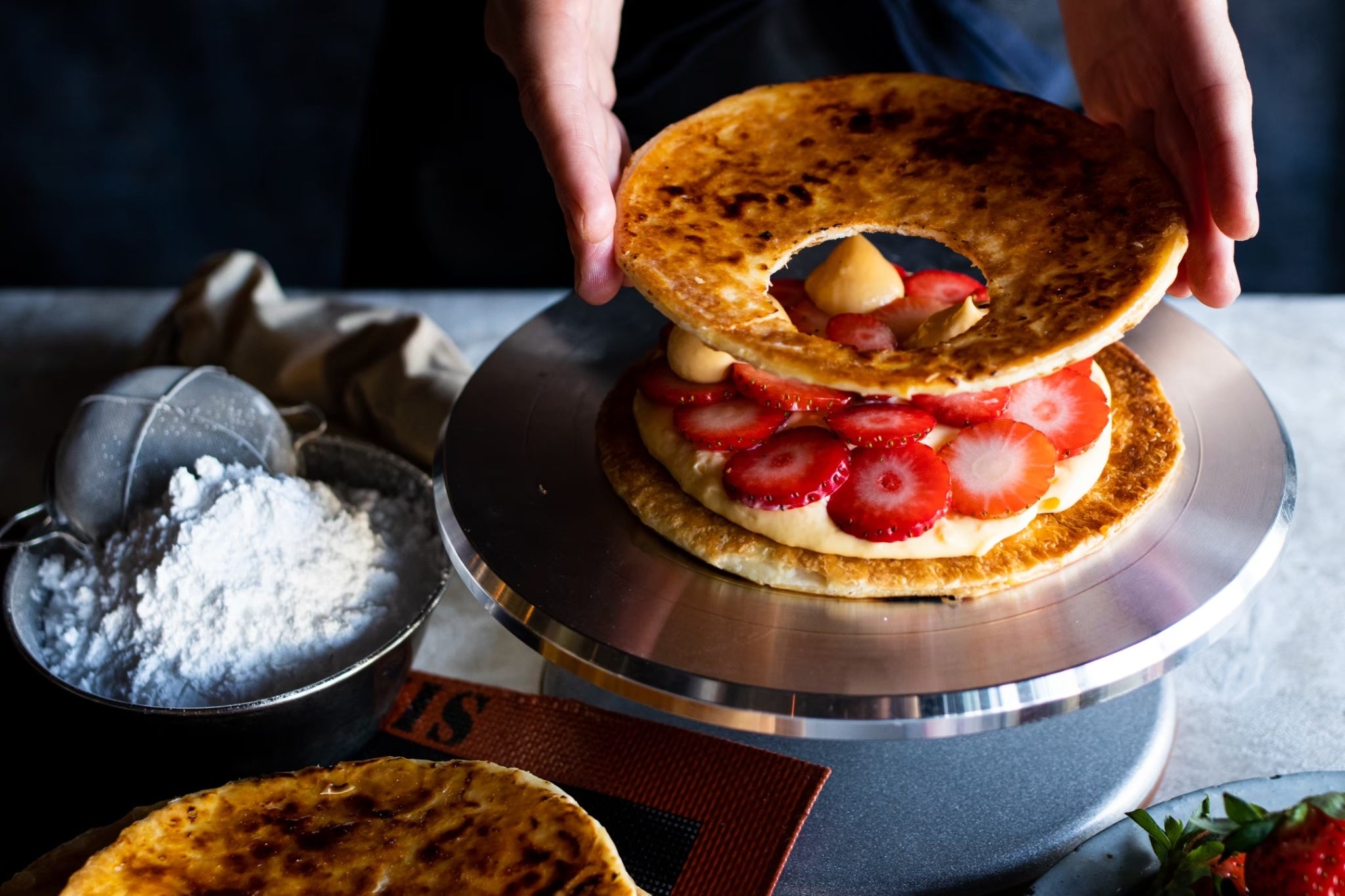パイのサクサクとした触感やフレッシュな自家製カスタード、瑞々しいフルーツとの組み合わせを手軽に楽しんでいただきたいという想いから、独特の丸い形とライブ感ある工程に至りました。