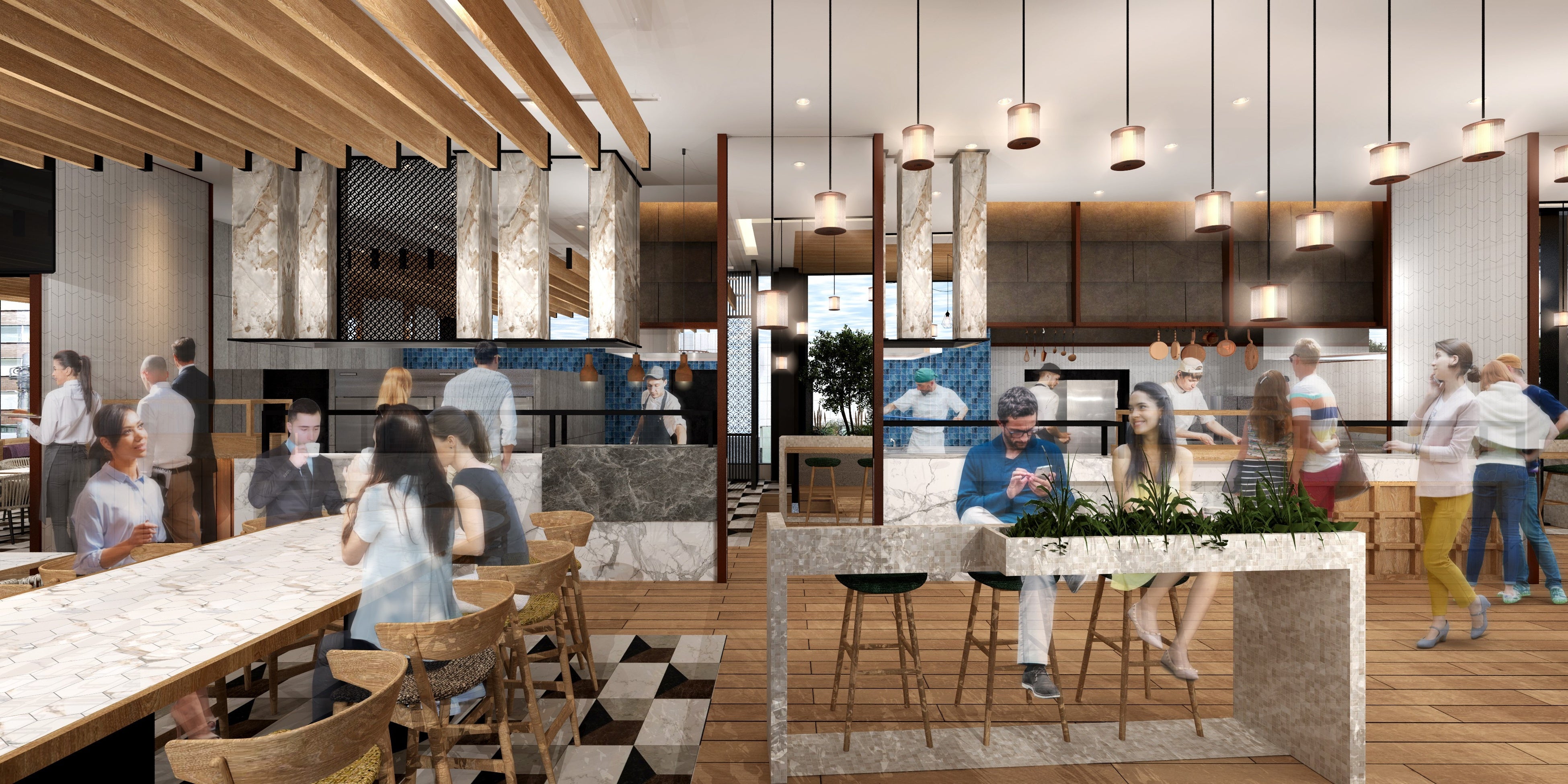 「オムニバス※食堂」をデザインコンセプトに掲げ、さまざまな人が、さまざまな捉え方、過ごし方をお楽しみいただけるよう、ゾーンごとに特徴を持たせた内装デザインを施します。自分の時間を豊かにするデザインと座席のレパートリーで「+α」の価値と、他とは異なるカジュアルさと高級感で「居心地の良さ」や「天神で働く誇り」を感じる空間を提供します。