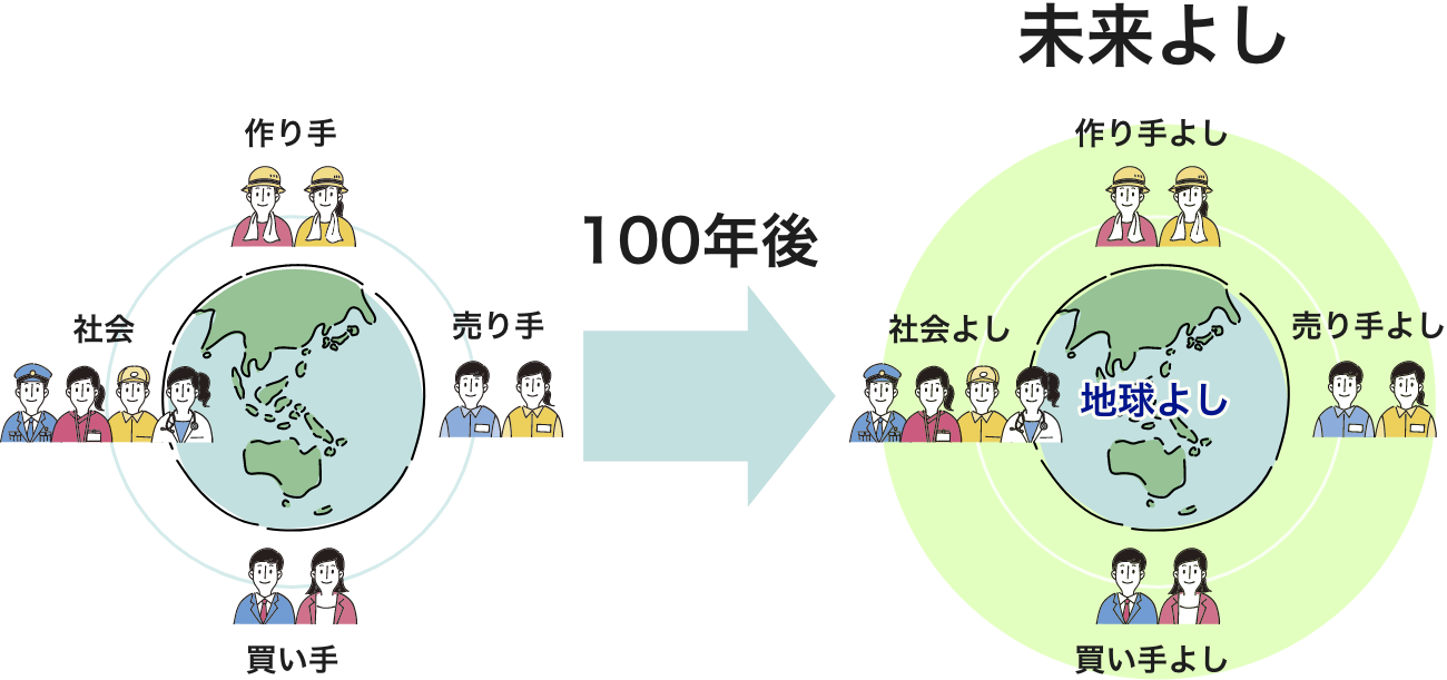 私たちは「農家さんが安心して農業を営める仕組みを創り続ける」をミッションに、作り手よし、売り手よし、買い手よし、社会よし、地球よし、未来よし、の「六方よし」になる商品・サービスの開発・提供を行っています。