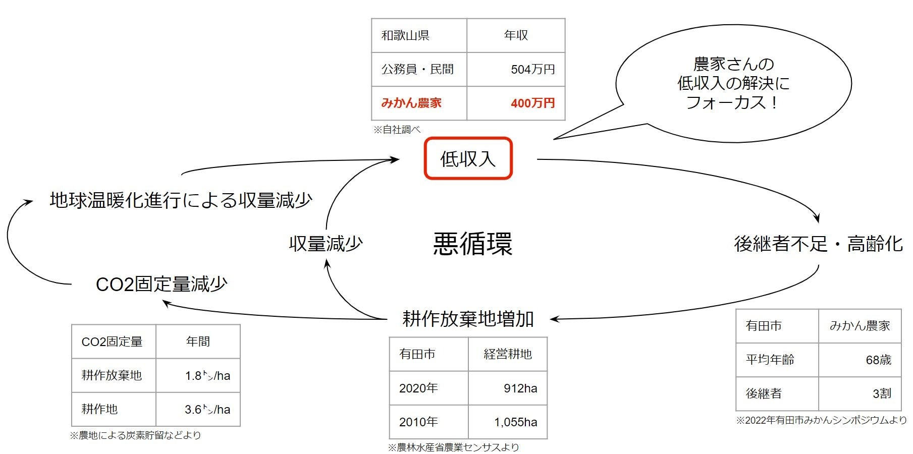 生産された柑橘のうち約5割に外皮に傷などがあり、味は美味しいのに見た目が良くないとの理由で安く買い取られてしまっており、それらをきっかけに、農家さんの収入減→後継者不足・高齢化→ 耕作放棄地の増加→収量減少→CO2固定量の減少→地球温暖化進行によるさらなる収量減少→農家さんの収入減という悪循環に陥っています。そこで私たちは、農家さんから傷のある柑橘を傷のない柑橘と同価格で買い取り、ドライ柑橘に加工し販売することで、農家さんの収入を向上させ、後継者増加→耕作放棄地減少→CO2固定量増加→地球温暖化抑制という善循環に変えていきたいと思っております。