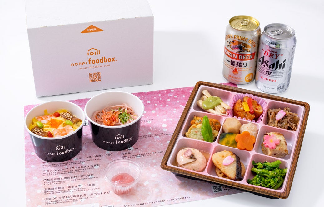 この度、nonpi foodbox® for onlineの人気シリーズである高級和食の老舗「神田明神下みやび」とのコラボレーション商品から、春の味覚の食材をふんだんに使用したプランをご用意しました。彩り華やかに仕上げた9種アラカルトの他、「ちらし寿司」や桜の風味を感じる「桜そば」、甘味にはつるっともっちりした可愛いらしい「葛餅」をお付けしました。