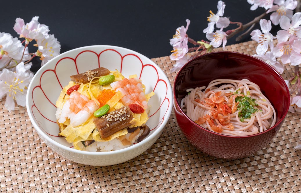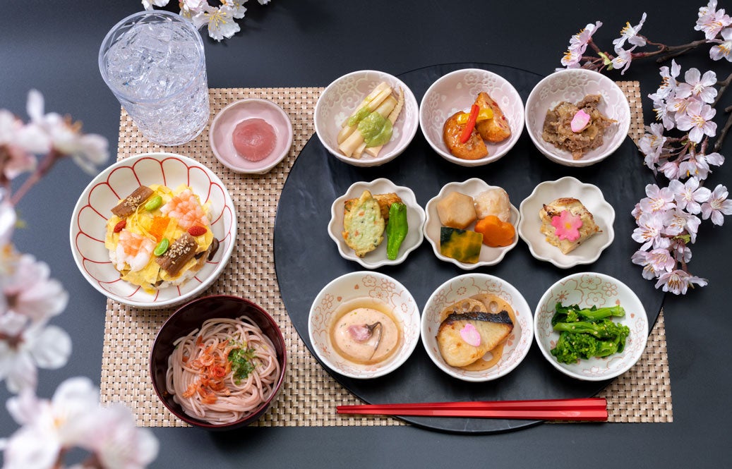 9種アラカルト、ちらし寿司、桜そば、葛餅、お好きなドリンク2本、ランチョンマット
