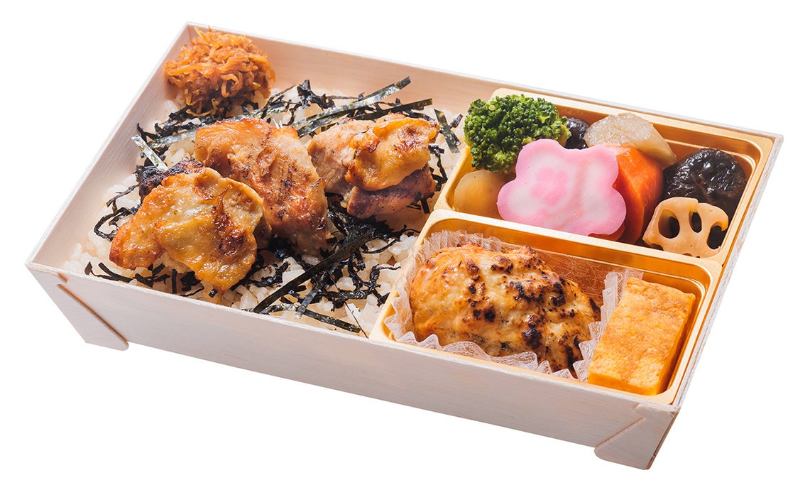 だし炊き込みご飯の上に刻み海苔と炭火焼き鳥を乗せました。炭火焼つくねや、だしを利かせたおかずも入ったボリュームのあるお弁当です。