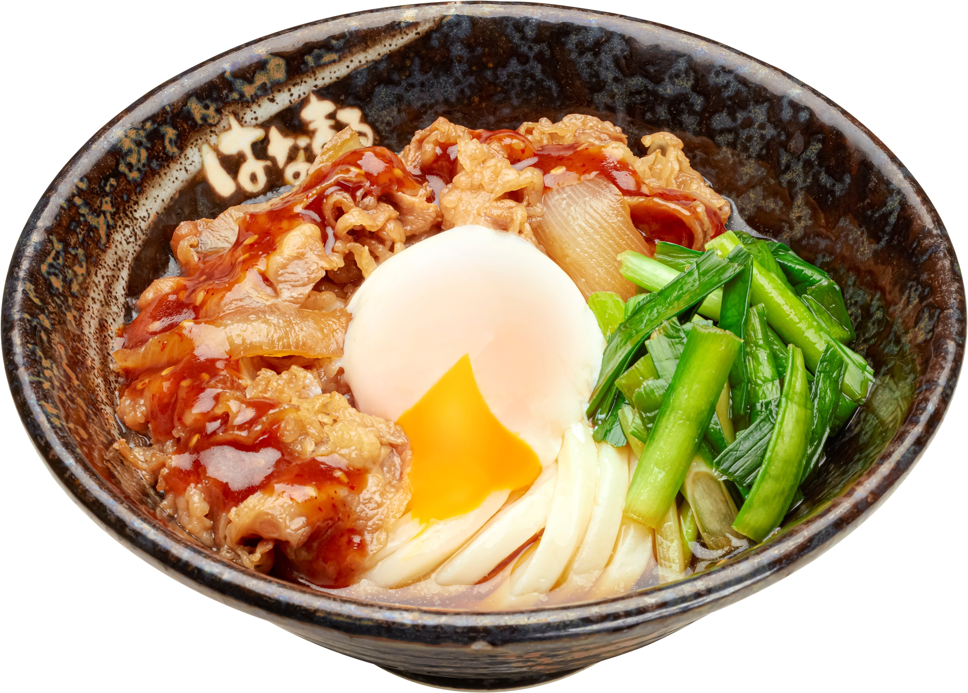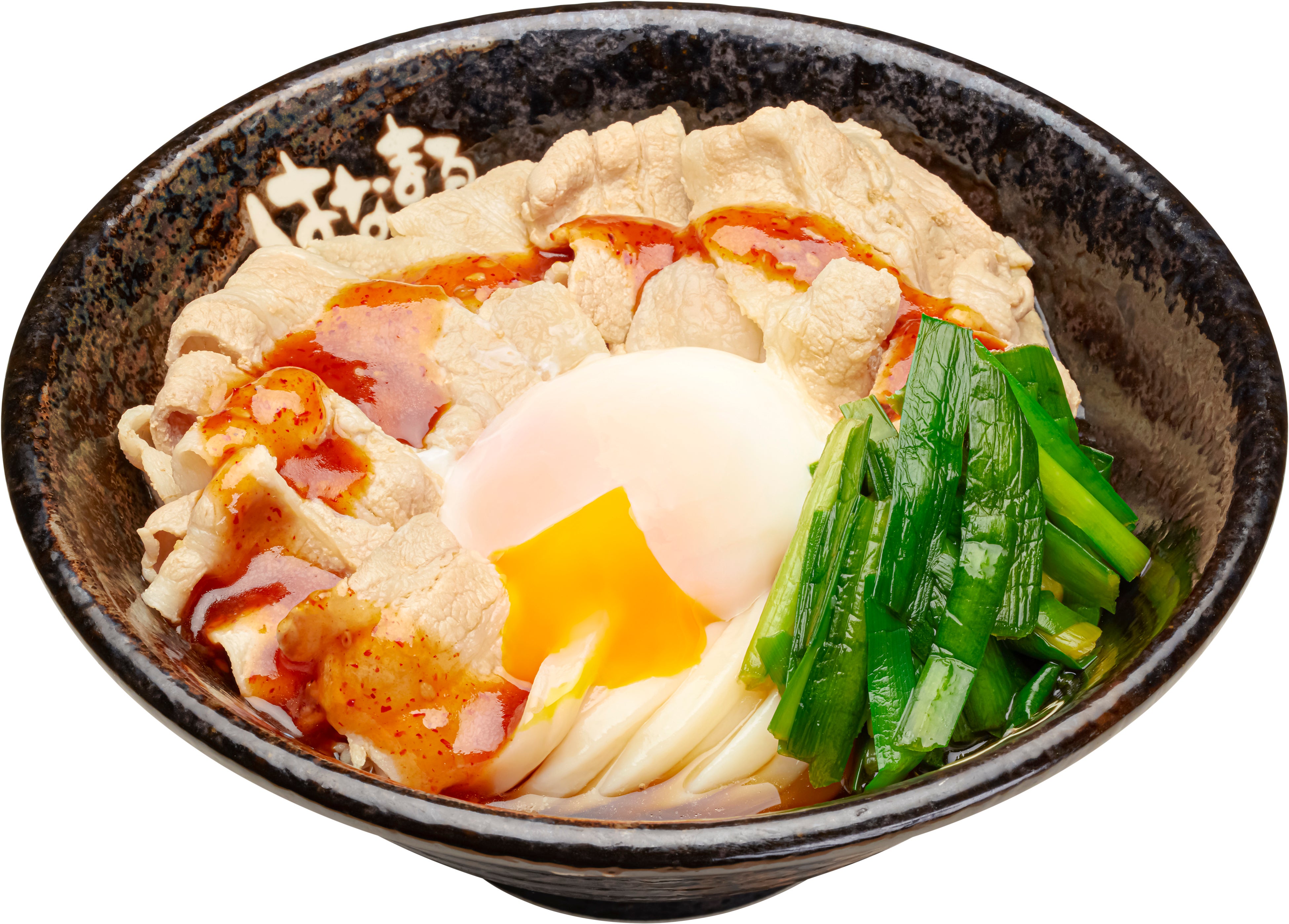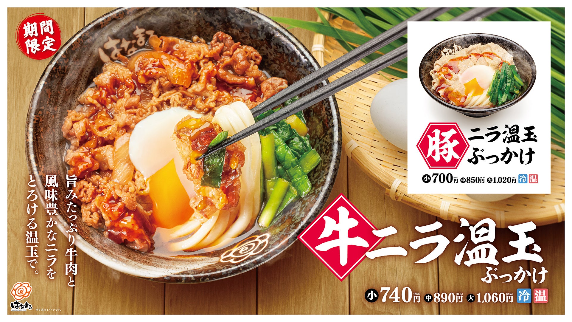 旨みたっぷりのお肉に旬のニラ、ガツンとしたニンニクの甘辛ダレ、とろける温玉がおりなす2種類のぶっかけうどんを期間限定新発売!