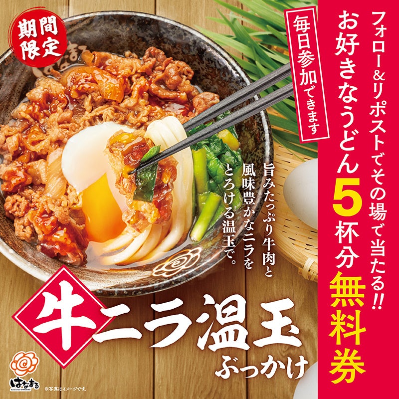 X公式アカウント(@hanamaru_udon)をフォローして、該当のキャンペーンツイートをリポストしていただいた方の中から抽選で、『お好きなうどん無料券』5枚を14名様にプレゼントいたします。