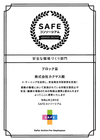 この度、当社の取り組みが評価され、厚生労働省が主催する『令和5年度SAFEコンソーシアムアワード』の「安全な職場づくり部門」にてブロック賞を受賞いたしました。
