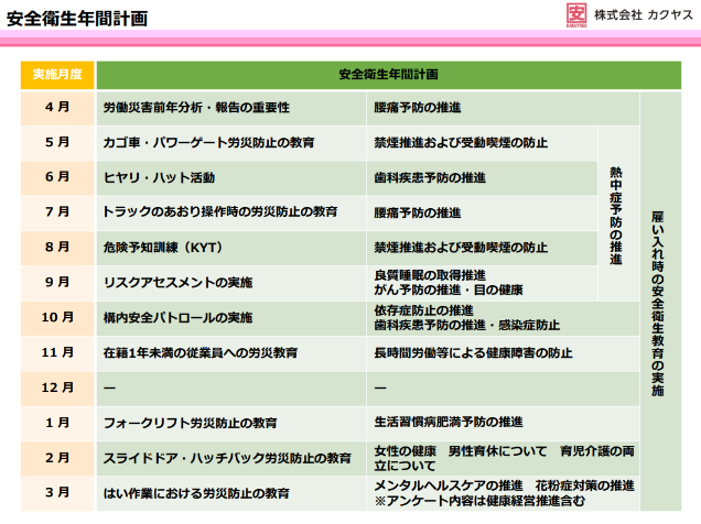 季節性や労働災害の発生状況を考慮した安全衛生年間計画を策定し、 社内イントラを通じて全従業員に向けてe-ラーニング及び確認テストを実施しております。掲載内容について継続的にモニタリングを実施し、従業員からの意見や要望を基に改善していくことで定着化を図ります。
