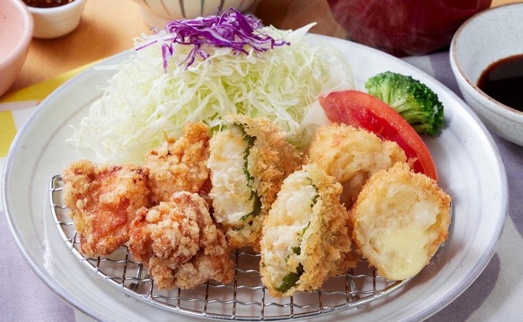 ホクホクの沖目鯛とじゃがいもが入ったサクふわコロッケと、香味唐揚げの合い盛り定食。コロッケは、軟骨入りの鶏つくねと大葉が入ったコロッケと、チーズの入ったコロッケで、2種の味と食感が楽しめます。 沖目鯛の脂質にはEPA(エイコサペンタエン酸)というオメガ3系に分類される不飽和脂肪酸が含まれています。この定食には健康効果の高いEPAのほか、日本人に不足しがちなカルシウムも含まれており、炭水化物、たんぱく質とともにバランスよく摂ることができます。