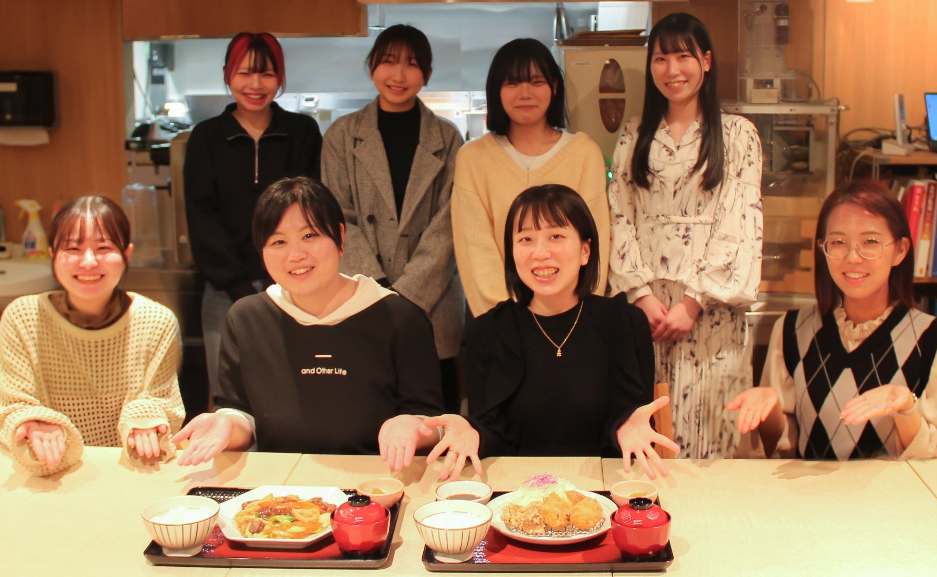 私たちのゼミでは、レシピの考案、食育、大量調理について取り組んでおります。今回の取り組みに参加したゼミ生は、家政学部管理栄養学科3年生7名、4年生2名です。私たちは楽しく調理をすること、おいしいごはんを食べることが大好きです。将来、さまざまな分野で活躍できる管理栄養士を目指し、国家試験合格を目標に日々努力しています。