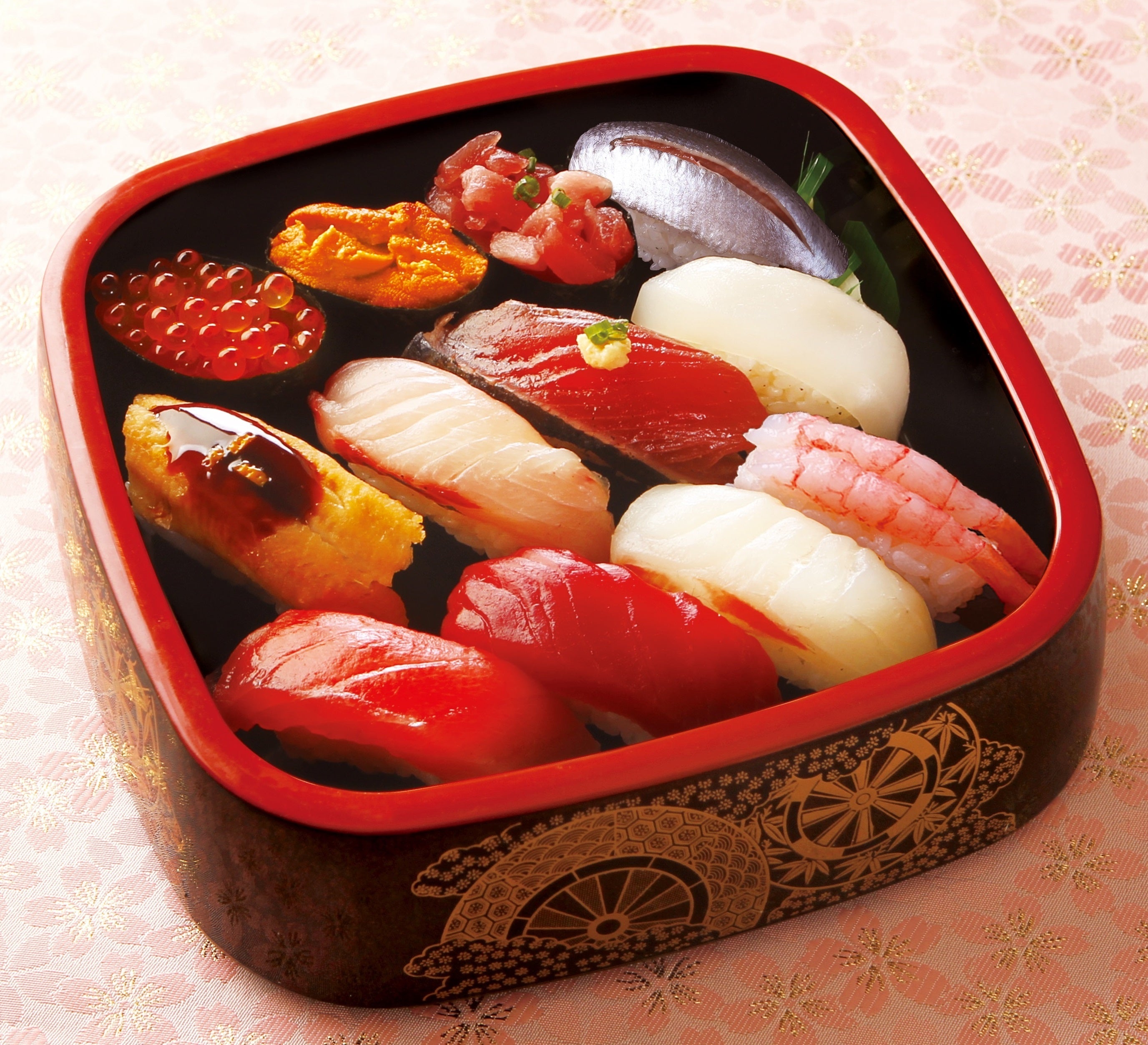 【商品内容】 春の旬ネタ5貫(しまあじ・真鯛・鰹のたたき・紋甲いか・いわし)、まぐろ赤身、いくら、甘海老、柚子ふり穴子、ねぎとろ