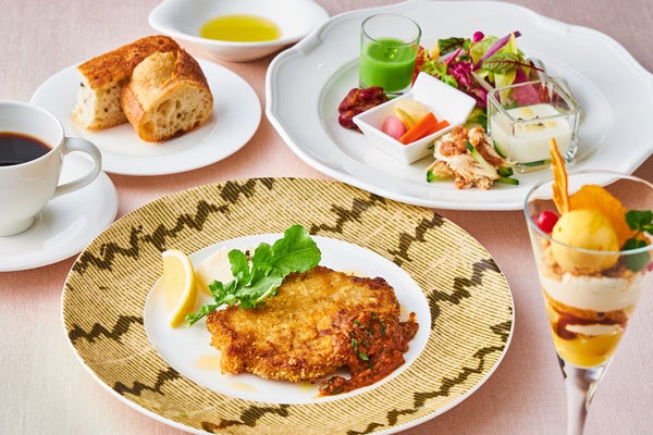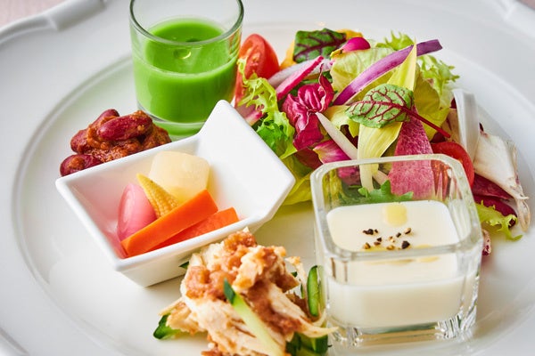 15種類の野菜を使用した前菜は、旬のものやヘルシー食材を用いてワンプレートにしました。鮮やかな緑色が目を引く一品は、旬のグリーンピースを使用した香りと甘みが格別なスープです。ヘルシー食材を使った料理では、豆を使った“チリコンカン”や、整腸効果がある梅肉を使った“鶏ささみと梅肉“、”豆乳ババロア“をご用意します。野菜サラダにかける“発酵ドレッシング”はオーヴェストのオリジナル。野菜の自然な甘さを引き立てる優しい味わいで、ヨーグルトを使用した腸活効果もあるドレッシングです。メインのパスタは2種類あり、それぞれ旬の野菜をお楽しみいただけます。みずみずしく柔らかな歯ごたえが特徴の春キャベツのクリームパスタ、柔らかさが増し甘みものった小松菜のペンネ ジェノベーゼソースよりお選びいただけます。プラス料金でメインを魚料理または肉料理に変更することもでき、魚料理はまさに今が旬の桜鯛をご提供いたします。クセがなくあっさりとした上品な甘みが特徴の桜鯛を焼き上げ、バルサミコソースにあわせたおすすめの一品です。食事の締めくくりには、酸味と甘みのバランスが絶妙な、デコポンや金柑のアイスなど春の柑橘類を堪能いただける季節のパフェをご賞味ください。