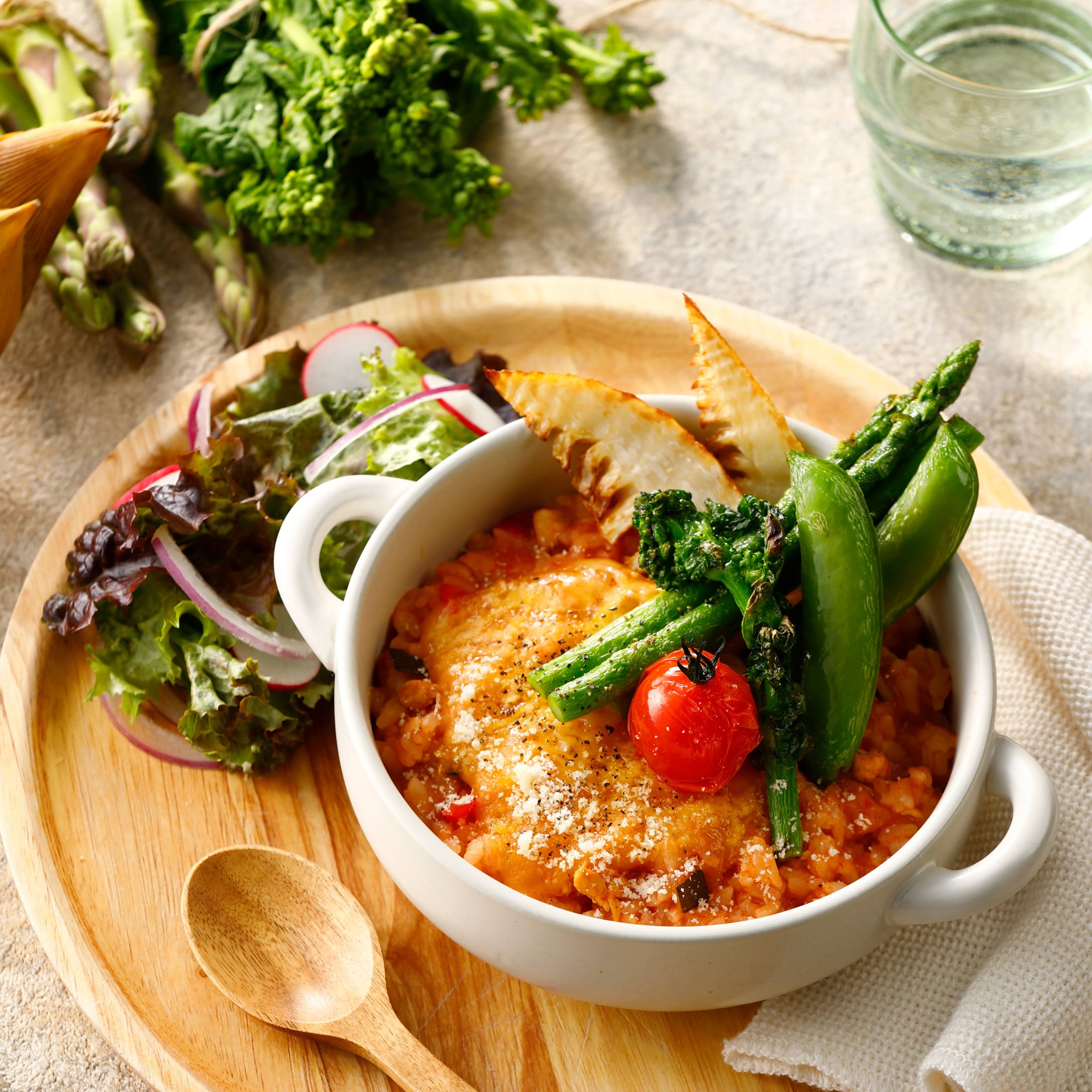 トマトをベースに旬の春野菜も楽しめる季節限定のリゾットです。リゾットにはトマトの他にも数種類の野菜や鶏肉などを使用して仕上げることで、旨味と酸味を引き出しました。また、マイルドな味わいが特徴のチェダーチーズをのせて焼き上げているため、混ぜてお召し上がりいただくことで、トマトの酸味がまろやかになり、ひと味違った美味しさもお楽しみいただけます。そして、旬を迎える春野菜から、たけのこや菜の花、アスパラを素揚げにしてトッピング。素材そのものの味わいはもちろん、豊かな彩りとともにお楽しみください。