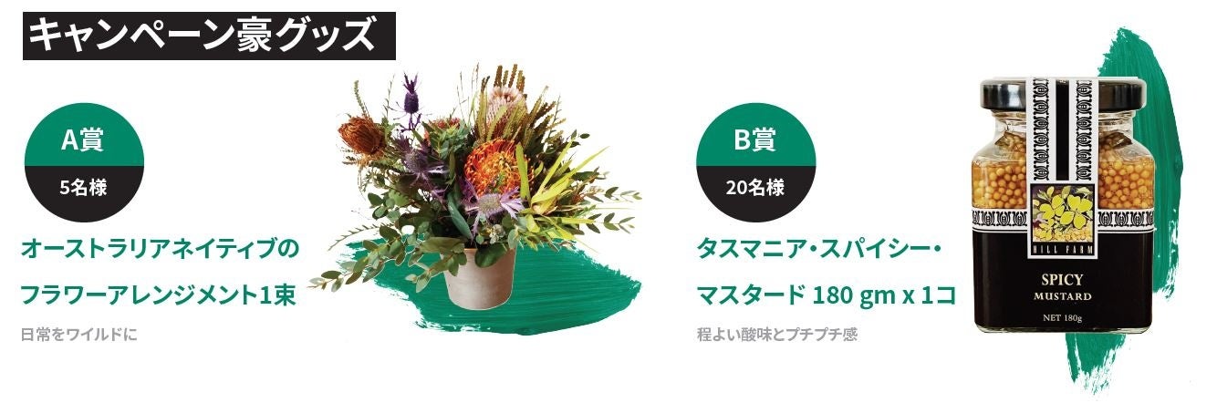 ① A賞:オーストラリアネイティブのフラワーアレンジメントx1束② B賞:タスマニア・スパイシー・マスタード 180 gm x 1コ