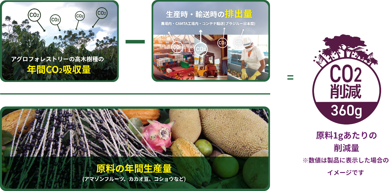 製品パッケージには、アサイーが栽培されているアグロフォレストリー農法のCO2吸収量を1製品あたりの削減量として換算した「CO2削減マーク」が表示されています。本マークの他社製品への使用は初の事例であり、ブランドコンセプトとの親和性の高さからこの度マークが記載されています。