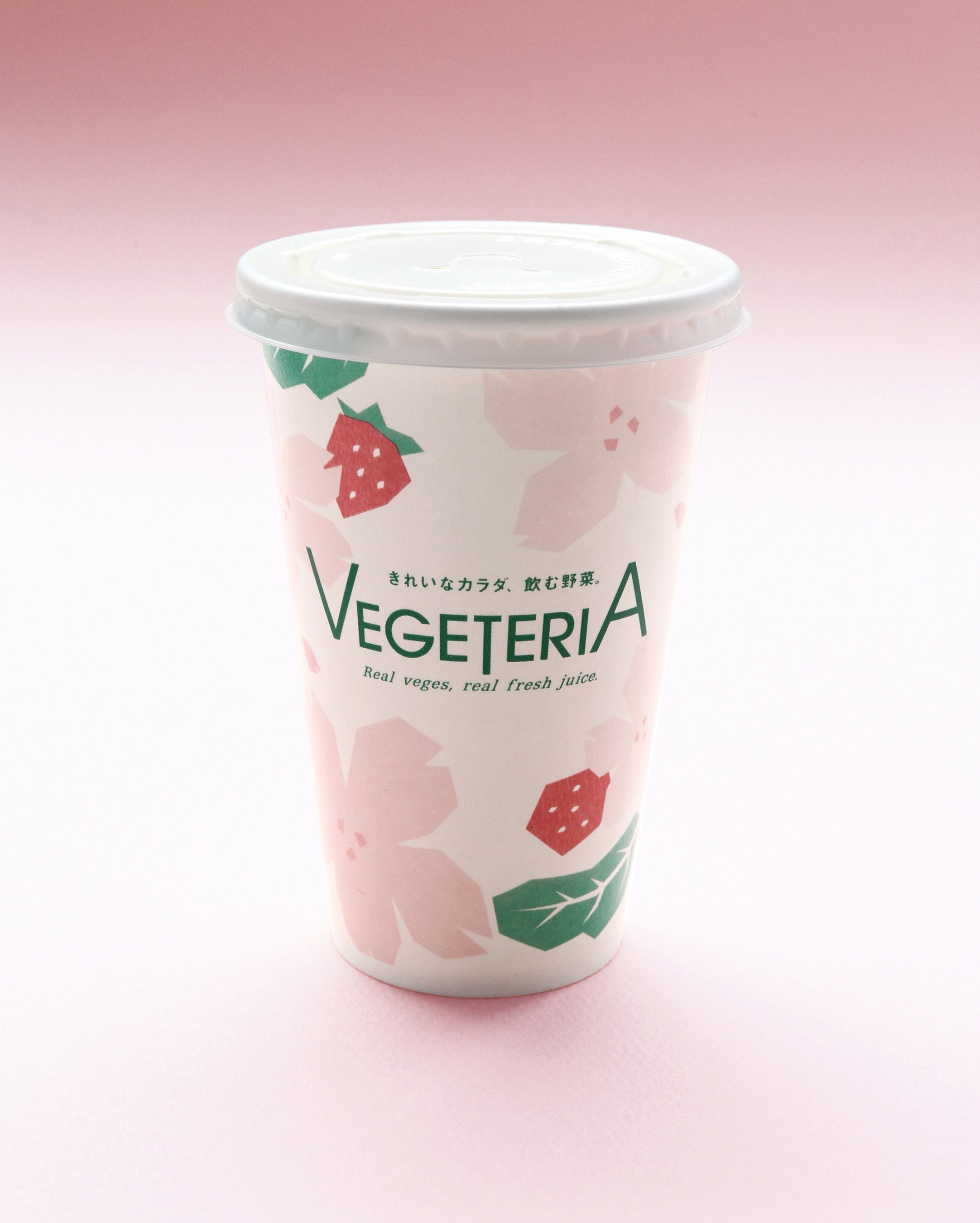 3月から4月にかけて、卒業、入学、就職、引っ越しなどライフステージが変化する人も多い時期。不安や緊張が入り混じる季節、カップを手にジュースを味わうその瞬間をぱっと晴れやかにしたい、新鮮な野菜と果物のチカラで元気に過ごしてもらいたいという思いを込めて、春限定のデザインカップを使用いたします。ベジテリアを代表するケールと旬のいちごに桜の花びらのデザインをあしらい、裏面には「Be happy!(がんばっていこう!)のメッセージを添えて心とカラダに野菜と果物のジュースでエールを届けます。