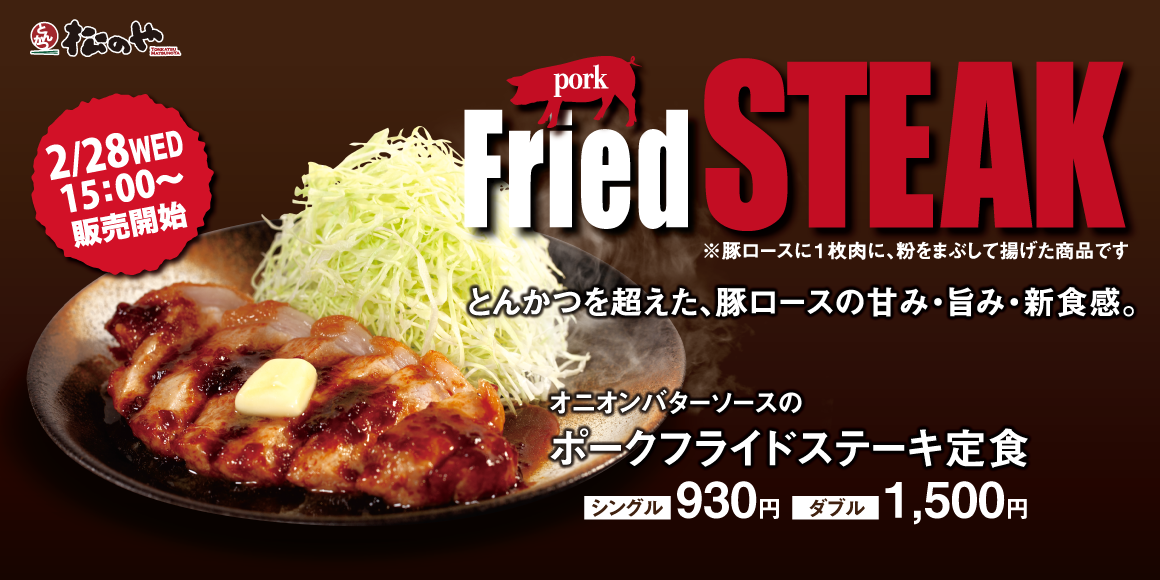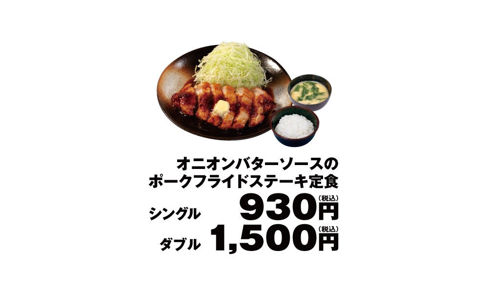 商品名 オニオンバターソースのポークフライドステーキ定食 930円 オニオンバターソースのポークフライドステーキ定食ダブル 1,500円 ※全て税込価格です。また、店内・お持ち帰りの税込価格は同一です。 ※お持ち帰りいただけます。お持ち帰りのみそ汁は、別途60円でお買い求めいただけます。 ※株主優待券は上記全てのメニューにご使用いただけます。(単品は除きます。) 発売日 2024年2月28日(水)午後3時~ 対象店舗 一部店舗を除く全国の松のや 下記URLをご参照ください。 URL:https://pkg.navitime.co.jp/matsuyafoods2/?dc=%7B%27c_campain49%27:%271%27%7D |