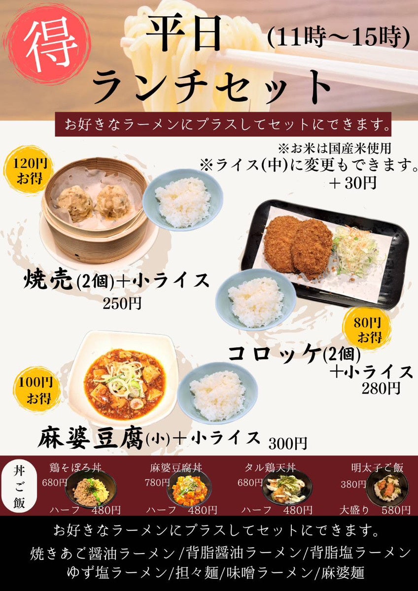 人気の焼きあご醤油ラーメンをはじめとして、背脂醤油ラーメン、貝出汁香るゆず塩ラーメンや担々麵をお出ししています。