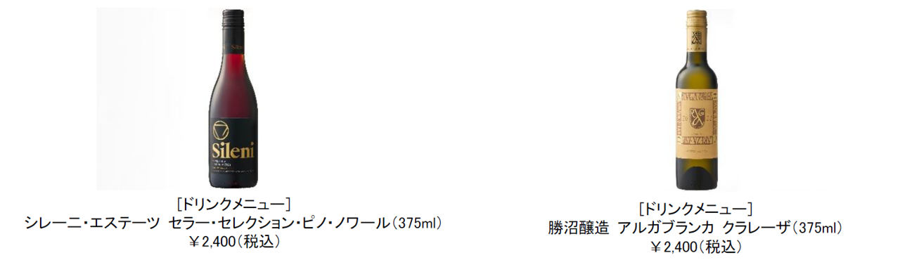 五十嵐美幸シェフがカフェテリアで提供するメニューと相性の良いワインをセレクトしました。軽やかな果実の香りと穏やかなタンニンのフレッシュかつ繊細な味わいが特徴の赤ワイン、シュールリー製法で醸した高い芳香性と酸でふくよかな味わいが特徴の白ワインの両方をご用意します。