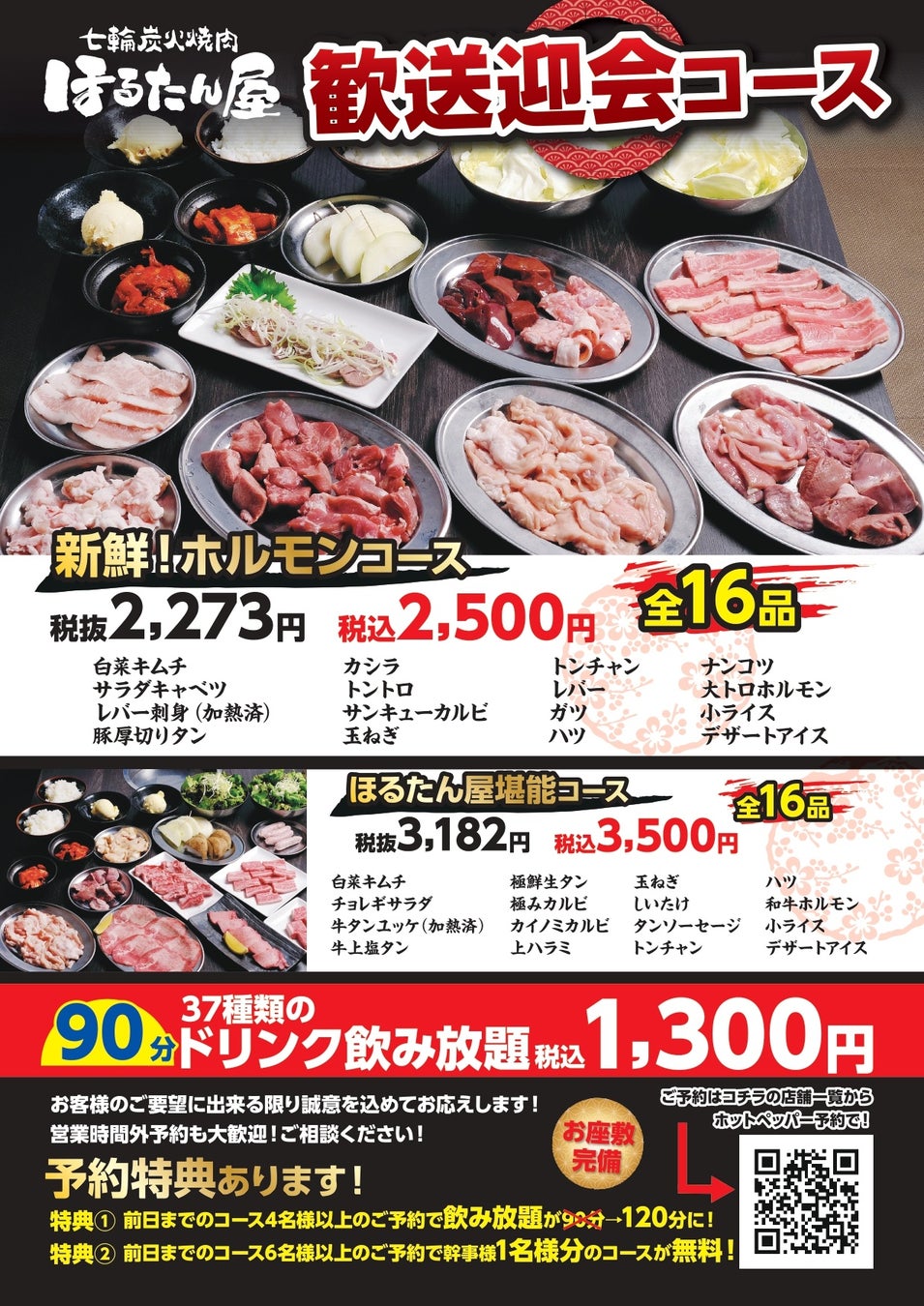 炭火七輪で、ほるたん屋イチ押しの新鮮な豚ホルモンや店内カットでジューシーな牛タンが楽しめる特別なプランとなっております!