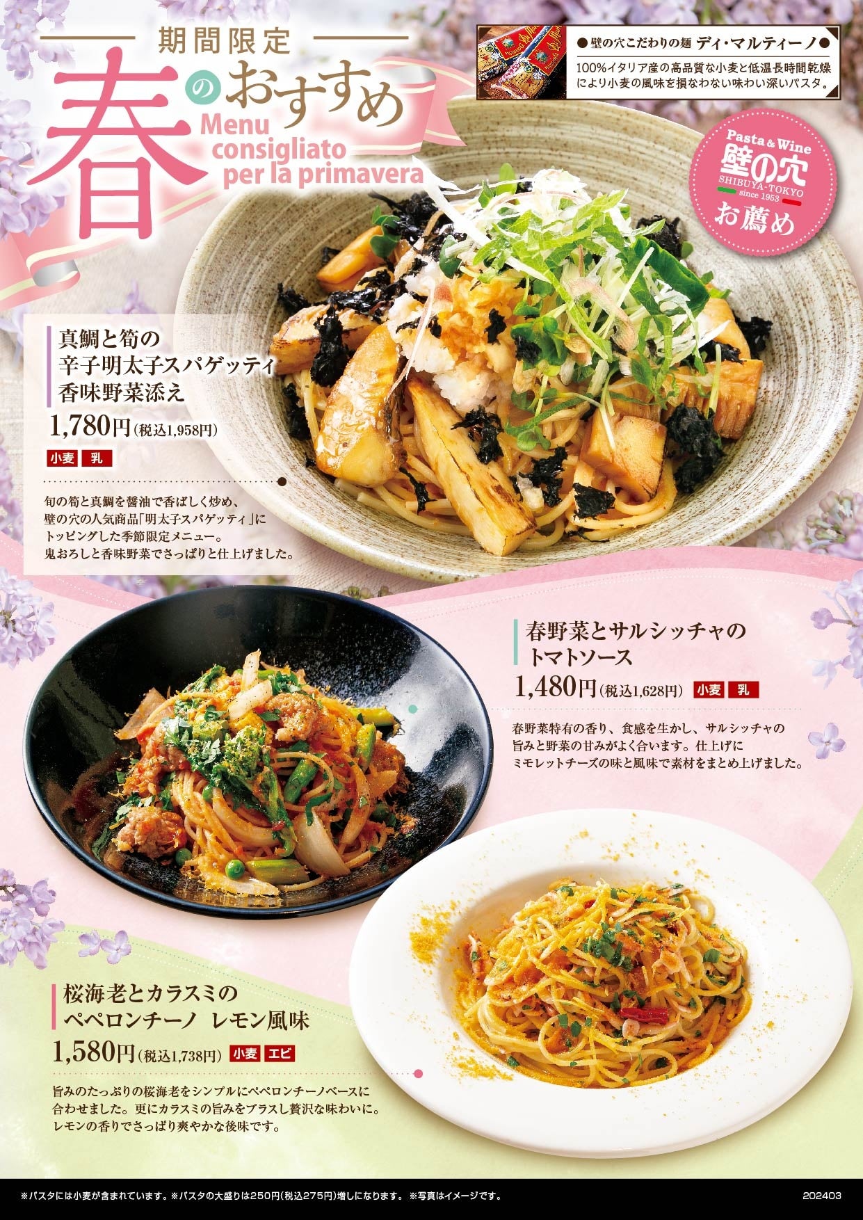 旬の筍(たけのこ)と真鯛を醤油で香ばしく炒め、壁の穴の人気 商品「明太子スパゲッティ」にトッピングした季節限定メニュー。