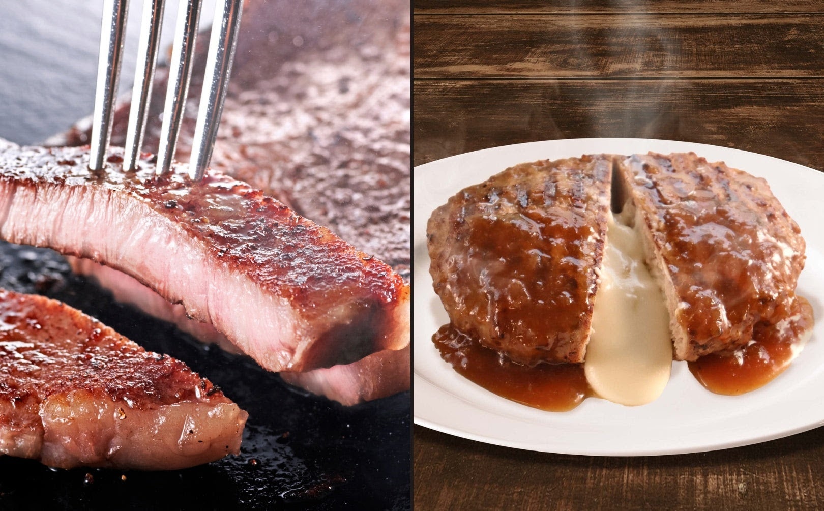 オーダーメニューでご提供する『ビーフステーキ』、肉汁と10種類のブレンドした濃厚なチーズが溢れ出す『チーズインハンバーグ』などすべて食べ放題!
