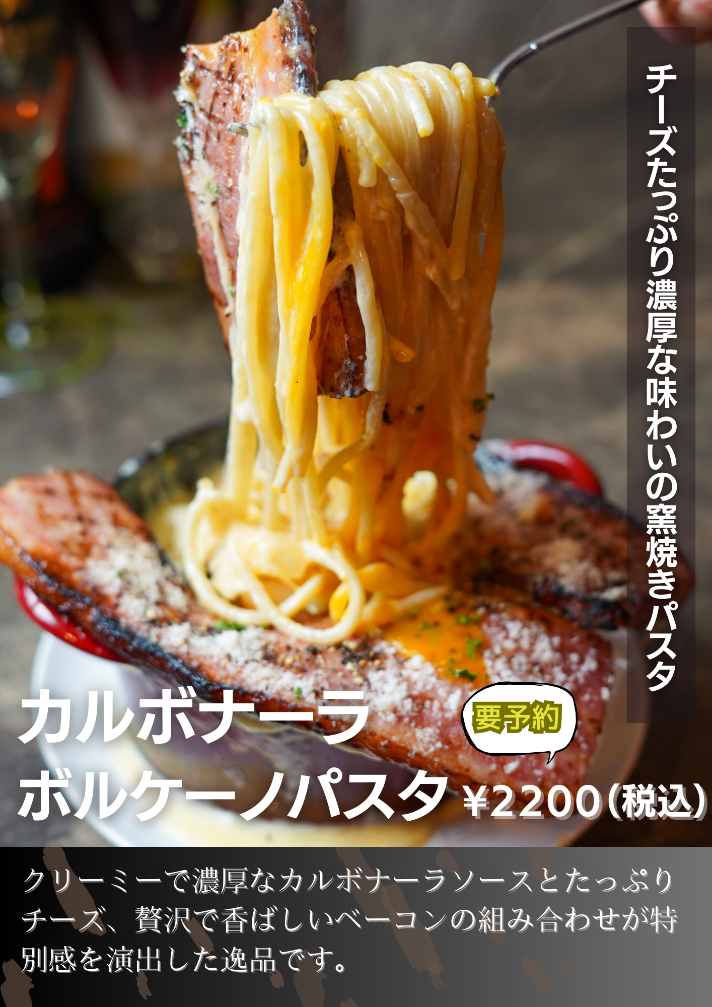 肉厚ベーコンを乗せたカルボナーラのボルケーノパスタもオススメ! ズワイガニシカゴピザは2900円 2つとも事前予約品で3/31までの期間限定品です! |