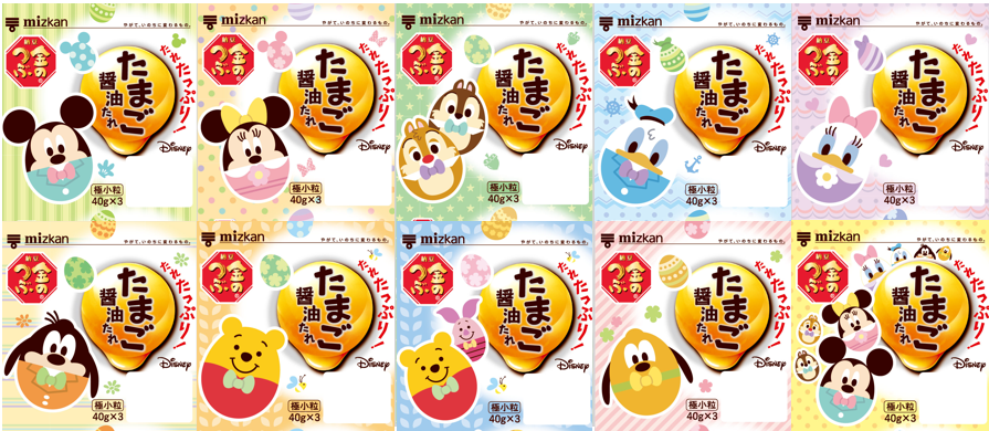 今回「たまご醤油たれ」のディズニーパッケージでは、過去最多となる全10種類のデザインで展開しております。キャラクターやカラーもそれぞれ異なり、バリエーション豊かなデザインでご用意しておりますので、その日の気分やお好きなキャラクター・色でパッケージを選ぶような、お買い物中の楽しさもお届けいたします。ぜひ、お気に入りのデザインを探してみてください。ディズニーパッケージは数量限定の為、売り切れ次第終了となります。