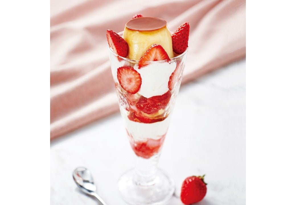 ストロベリーを絡めたナタデココや細かく砕いたファヤージュの上に、旬のいちごとカスタードプリン(ミニ)をトッピングした期間限定のパフェです。