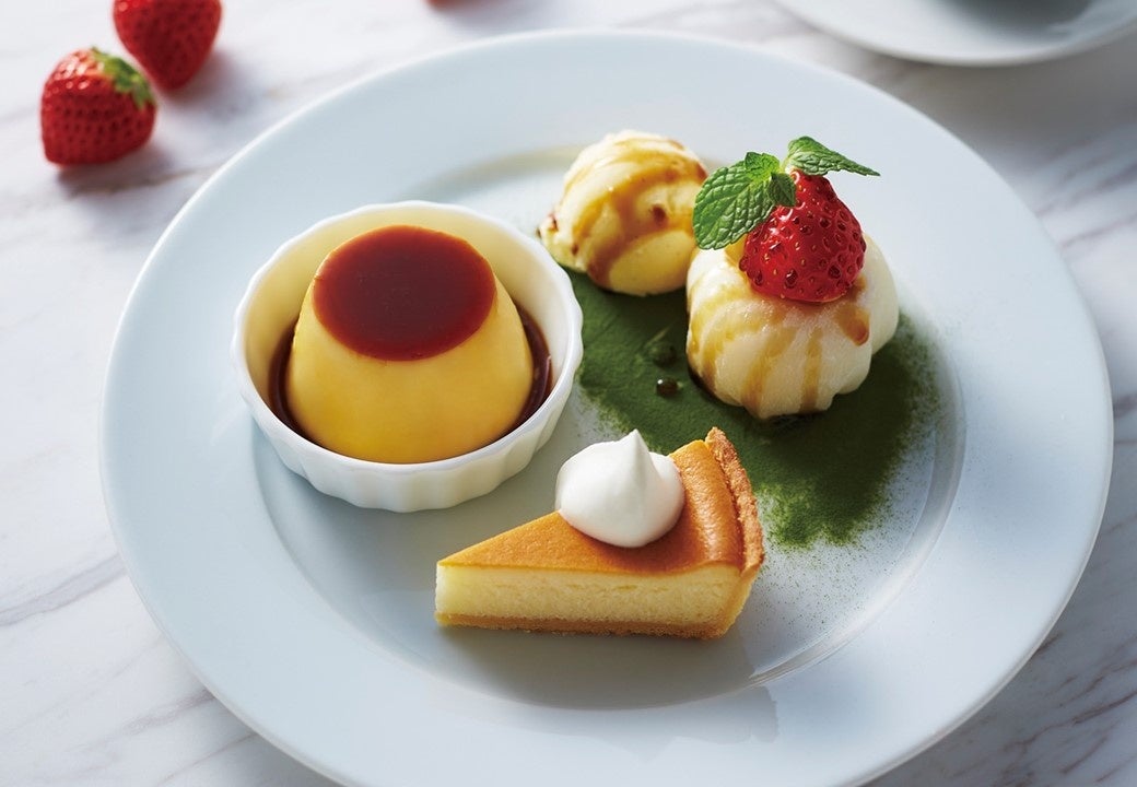 京抹茶と黒みつを添えたいちごのクリーム大福、バニラアイス、カスタードプリン(ミニ)、デンマーククリームチーズケーキをワンプレートに盛り合わせました。