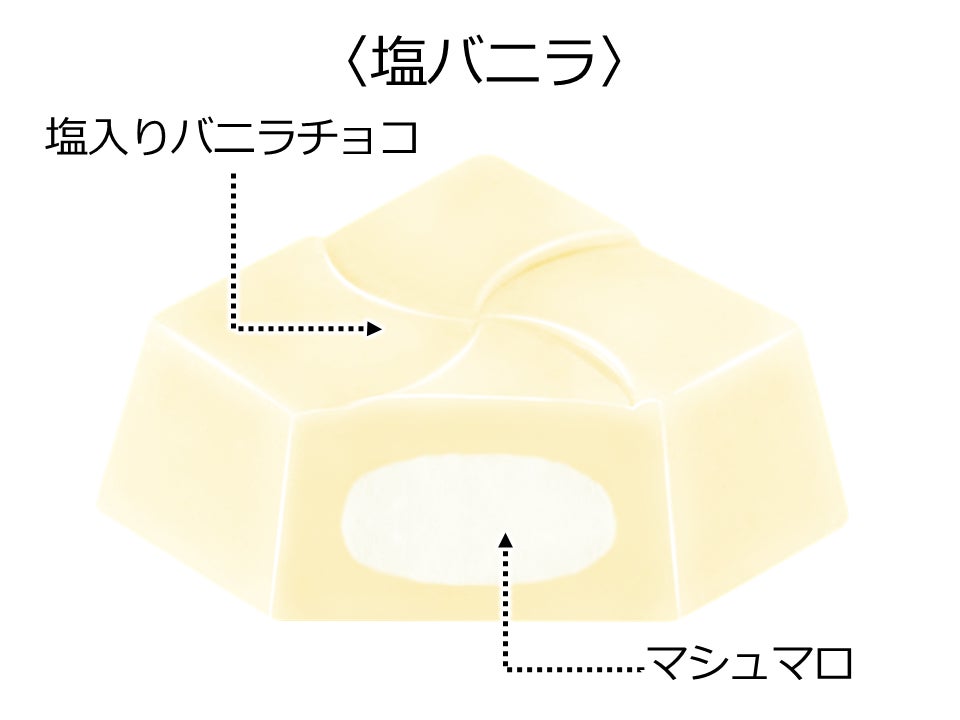 ミネラル豊富なオホーツクのあら塩を混ぜ、バニラチョコにマシュマロを合わせました。