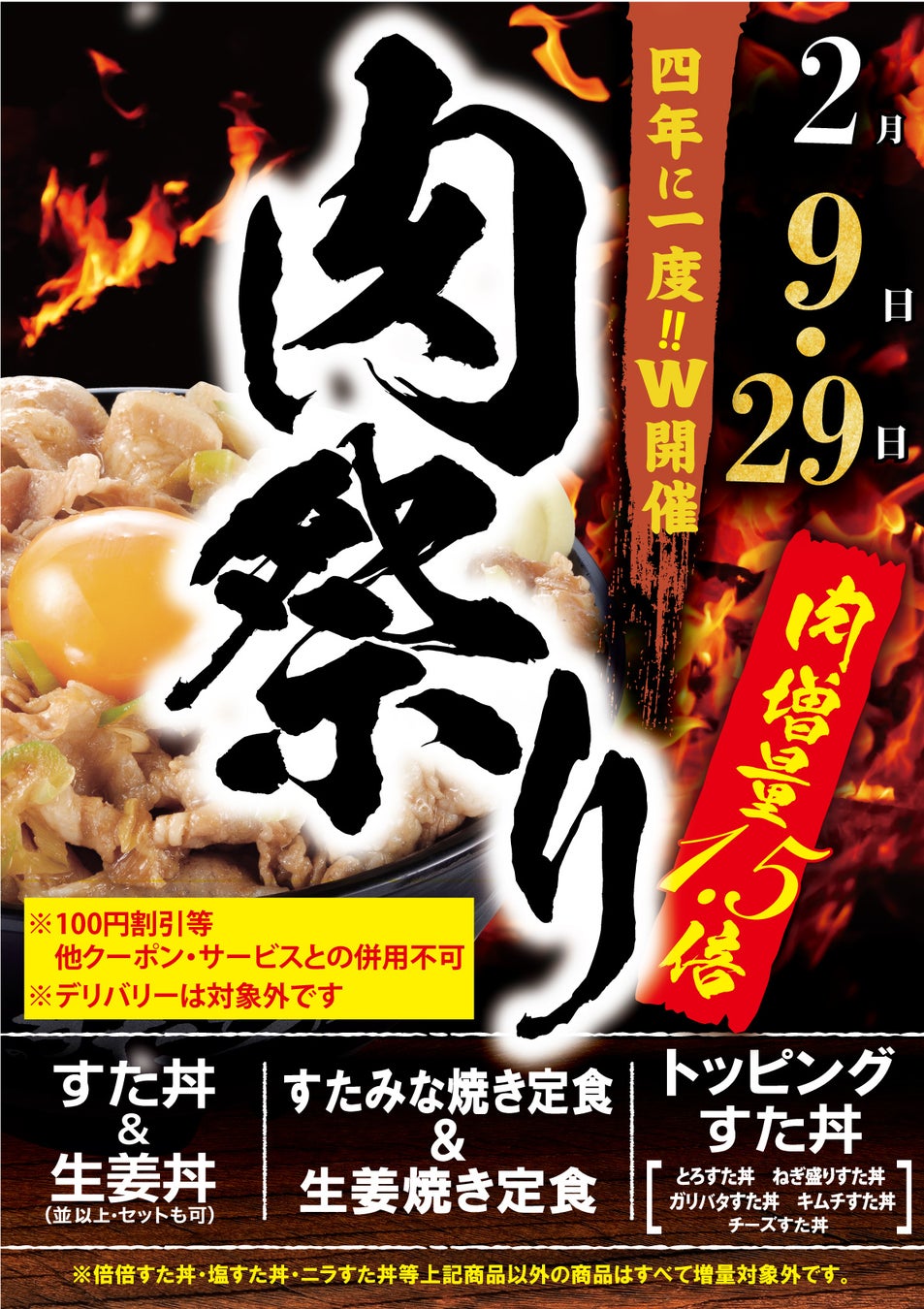 『食を通じて、日本全国さらには世界の人々の底力となる』という企業理念を掲げる当店は、度重なる値上げで大変な状況だからこそ、肉&ニンニクパワーですたみなをつけて頑張って欲しいと考えております。特に今月は『肉の日キャンペーンW開催』ということで、2月9日(金)に第1回目となる『肉の日キャンペーン』を実施しましたが、通常に比べて来客数が140%以上増加するほどの大好評ぶりでした。通常であれば月1回の開催ですが、今年は4年に一度のうるう年!2月9日(金)に引き続き2月29日(木)にも第2回目となる『肉の日キャンペーン』を実施するので、もう一度すた丼をお得に食べられるチャンスがあります!是非この機会に秘伝のニンニク醤油ダレのパンチが効いたすた丼を思う存分ご堪能いただき、すたみなをつけて頑張っていきましょう !