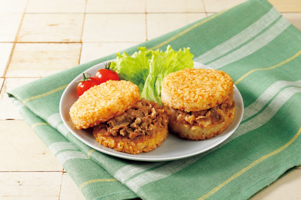 生活クラブでは、全国の組合員とともに製品の新規開発や改善をすすめる会議を毎月行なっています。その中で「現在取り扱うライスバーガーは塩分が濃いと感じる」という意見があり、改善を検討しました。しかし、現行品は人気が高いため、新たに塩味を抑えた甘めの味付けの「焼肉風ライスバーガー」を開発し、バリエーションを増やすことで組合員要望に応えました。本品は、原材料の米・牛肉・調味料もほとんどが生活クラブの提携生産者のものを使用。生活クラブの共同開発米「那須山麓米(JAなすの産なすひかり)」を使用したライスパテに、甘辛く味付けした北海道チクレンの牛バラ肉を贅沢にサンドした食べ応え十分のライスバーガーです。