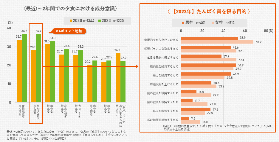 2020年と比べて、夕食で意識していることでは「たんぱく質を多く摂る」は8.6ポイント増加し、トップの「食物繊維を多く摂る」と同等レベルに達しました。また、たんぱく質を摂る目的は、男女ともに「健康的なからだ作りのため」が最多でした。 (レポート11頁参照)