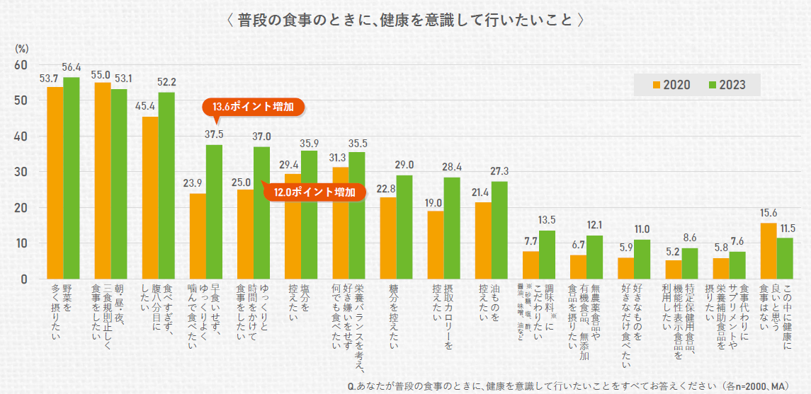 食事のときに健康を意識して行いたいことは、2020年と比べて、「早食いせず、ゆっくりよく噛んで食べたい」は13.6ポイント、「ゆっくりと時間をかけて食事をしたい」は12.0ポイント増加し、健康づくりにおいて日常の食生活習慣がより意識されている様子がうかがえました。(レポート8頁参照)