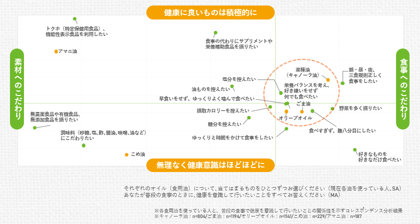◆食事での健康意識は“よく噛んで/時間をかけて”が大幅に増加 ◆「オリーブオイル」「ごま油」使用者は“食事そのもの”、「こめ油」使用者は“素材”にこだわりたい傾向