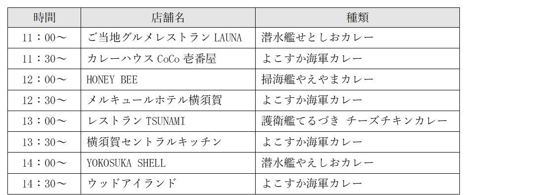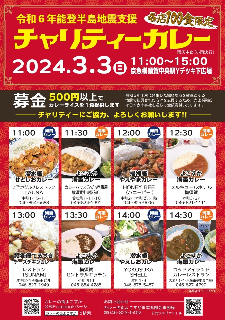 500 円以上の募金で、カレーの街よこすか事業者部会の加盟事業者が、「よこすか海軍カレー」もしくは「横須賀海上自衛隊カレー」を1 杯提供します。カレーの提供は事業者8 店舗が30 分ごとに交代して行います。集まった募金全額は義援金として日本赤十字社を通じて被災地に寄付いたします。
