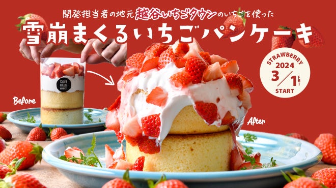 」にて、2024年3月1日(金)~2024年5月31日(金)の期間限定で『開発担当の地元”越谷いちごタウン”の いちごを使った雪崩まくるいちごパンケーキ』を販売致します。