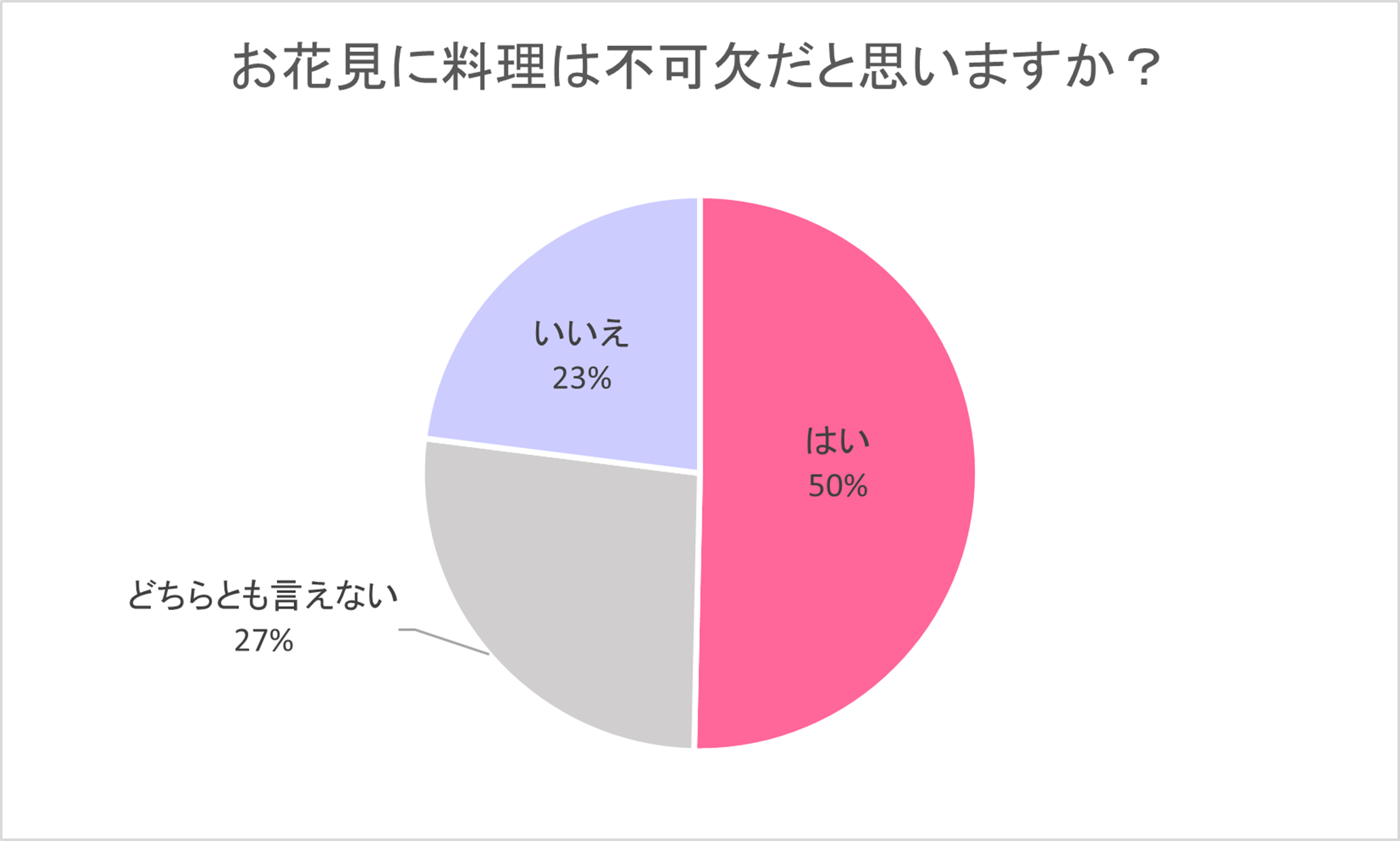 次に、「お花見に料理は不可欠だと思いますか?」と質問すると、半数が「はい」と答え、27%の方が「どちらとも言えない」、23%の方が「いいえ」と回答しました。
