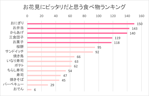 お花見にピッタリだと思う食べ物をお聞きすると、1位が「おにぎり」で150票、2位が「お弁当」で143票、3位が「からあげ」で140票と、上位3位は食事メニューが占める結果でした。