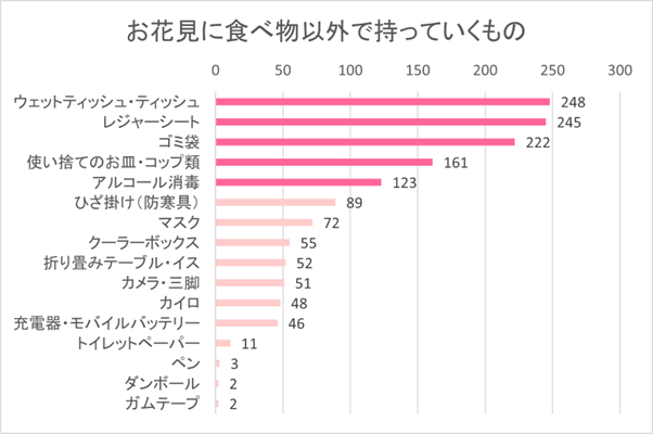 次に、お花見に食べ物以外で持っていくものをお聞きすると、「ウェットティッシュ・ティッシュ」が248票と最多で、続いて「レジャーシート」が僅差で245票、「ゴミ袋」が222票という結果でした。