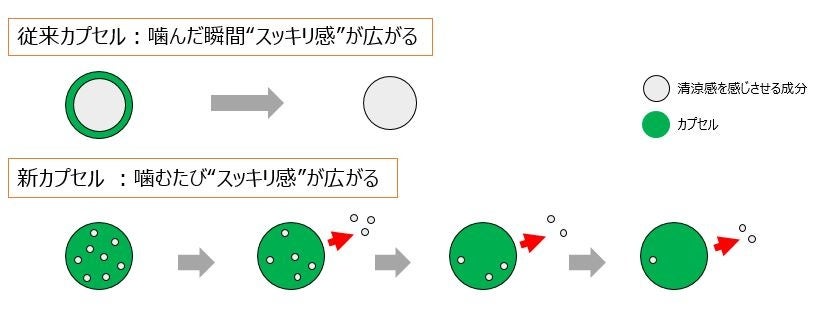 従来のカプセルは噛んだ瞬間にカプセル中の清涼成分が弾け、一度にスッキリ感が広がる設計でした。「新息爽やかEXカプセル」では、カプセルの構造を一新しました。噛むたびに清涼成分が広がり、長くスッキリ感を体感できる設計です。