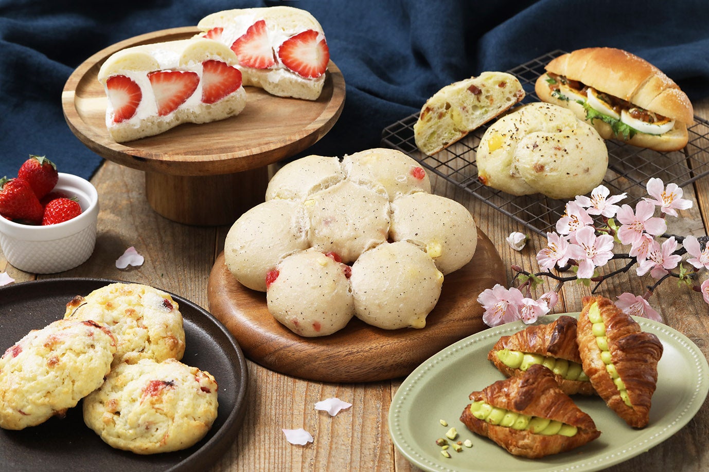 シリーズ累計41万個以上※1販売した人気商品『京生ちぎりパン』の季節限定フレーバー『京生ちぎりパン〜ダージリンティー「苺」〜』、桜の花の塩味とホワイトチョコの甘味が絶妙な『スコーン SAKURA』、旬の苺とマスカルポーネホイップをサンドしたデザートベーグル『ベーグルサンド〜苺〜』、ピスタチオ好きな方におすすめしたい手軽なクロワッサン『ミニクロピスタ!』、ピクニックなど春の行楽にもおすすめなボリューム満点の『春のてりたまサンド』、ピンク、みどり、黄色の春を思わせる具材を使用した季節限定ベーグル『ベーグル 燻製ベーコンとそら豆チーズ』の全6品で春の訪れを彩ります。おいしさはもちろんのこと、ビジュアルからも春をお楽しみいただける彩り豊かなラインナップで”パンマルシェ”をイメージした季節限定商品をご賞味いただきたいと考えております。