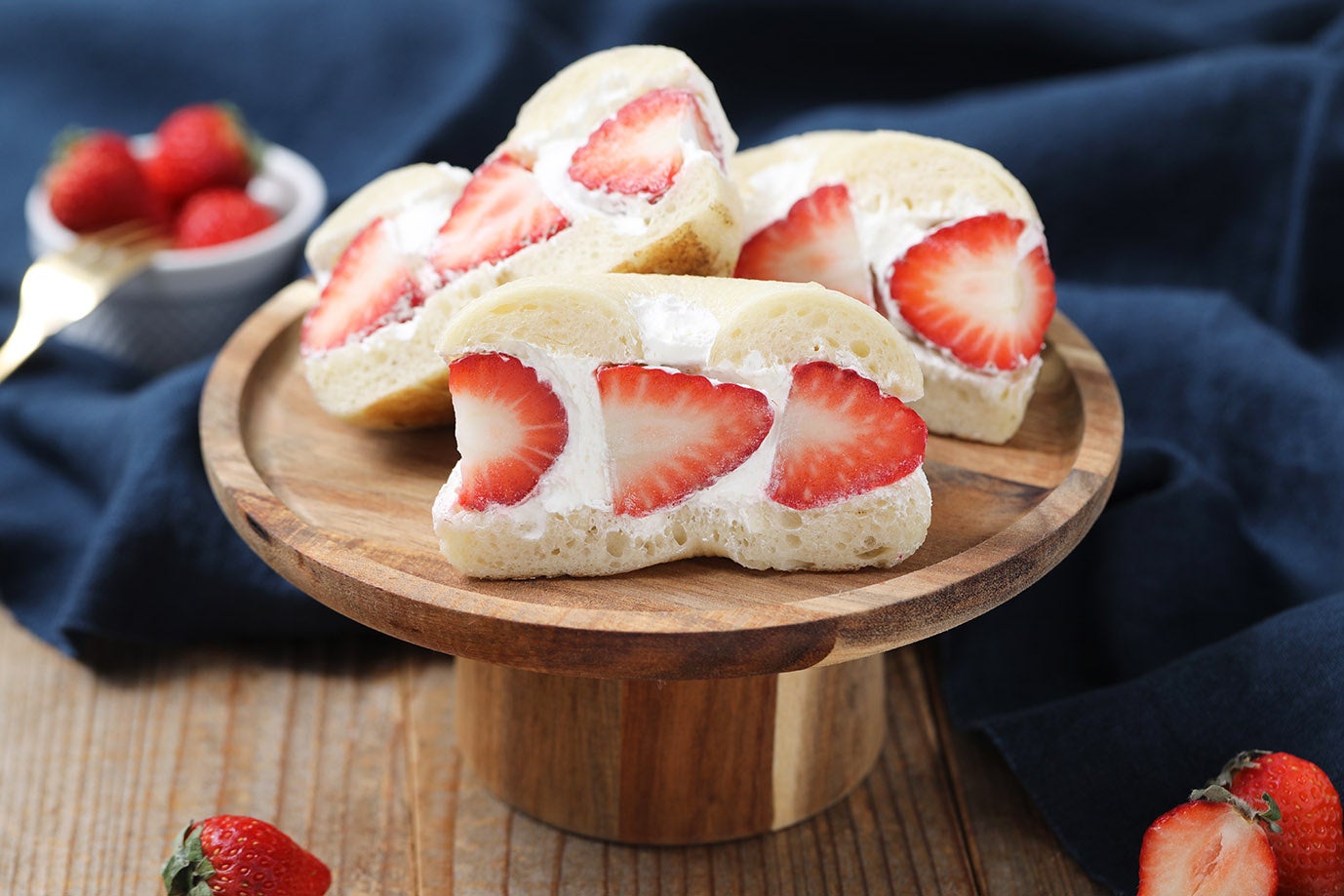 と旬の苺をサンドしました。ベーグルのもっちりとした食