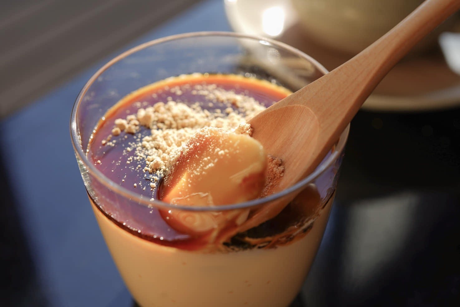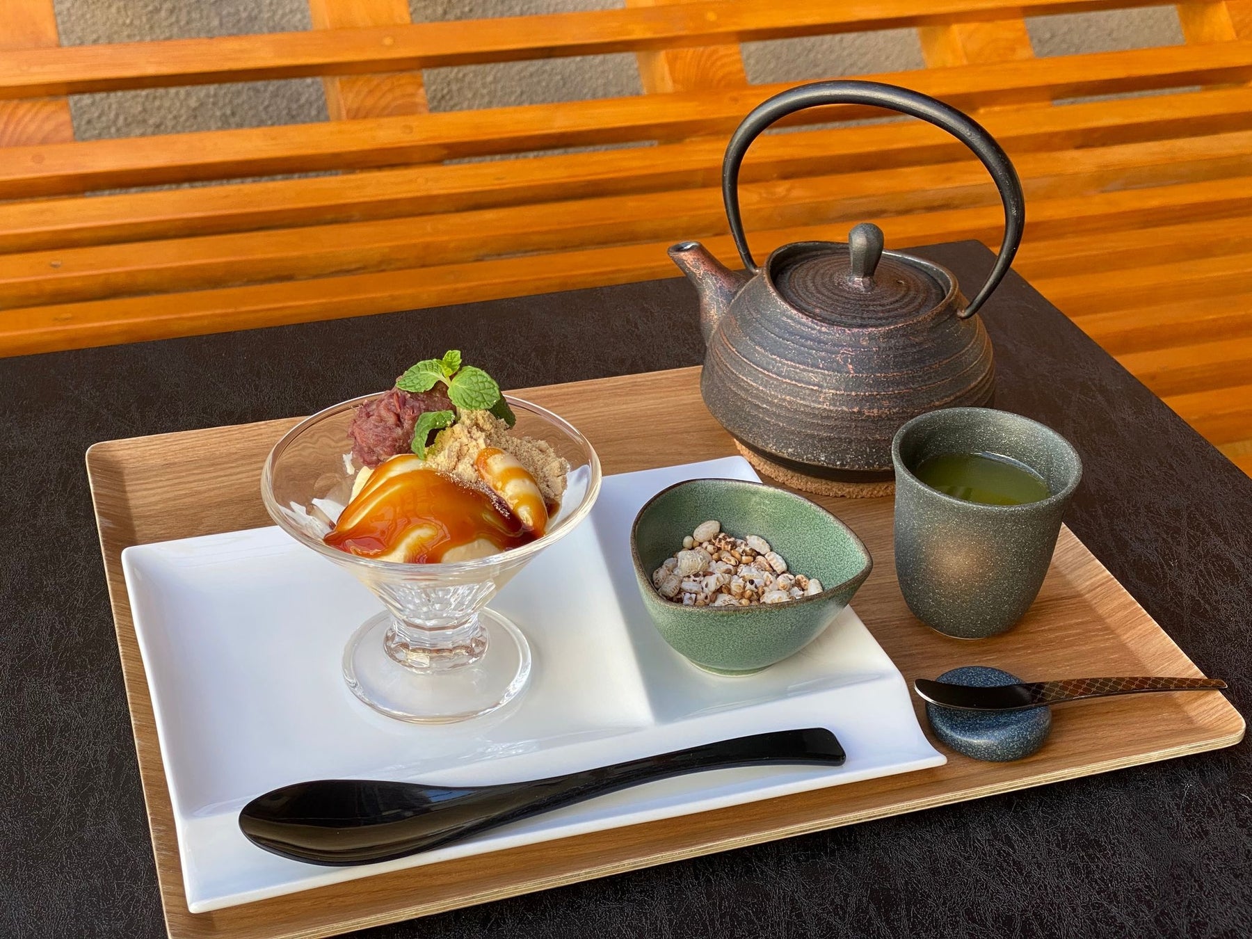 もっちり食感のくず餅プリンに北海道産の大納言あずき餡を添えて和プリンに仕上げました。くず餅乳酸菌入りのとろ~りとした黒蜜と香ばしいきな粉、さらに無糖の玄米パフを絡めることで”フワッとサクッ”とした香ばしさが加わり、口に運ぶごとに様々な表情をお楽しみいただけます。またドリンクセットなのでお好みのドリンクをお選びいただけます。(写真は屋久島無農薬二番茶です。)