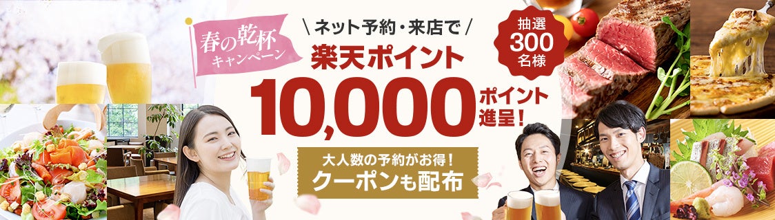本キャンペーンでは、対象の飲食店でランチ1,500円以上、ディナー3,000円以上のコースを2名以上でネット予約・来店した方から抽選で300名様に「楽天ポイント」10,000ポイントを進呈します。さらに、宴会幹事に向けて大人数の予約がお得になるクーポンとして「ぐるなびネット予約クーポン」開始以来、最高額となる最大25,000円OFFのクーポンも同時期に発行し、「楽天ポイント」やクーポンを獲得しながらお得に春の宴会を楽しむことができます。