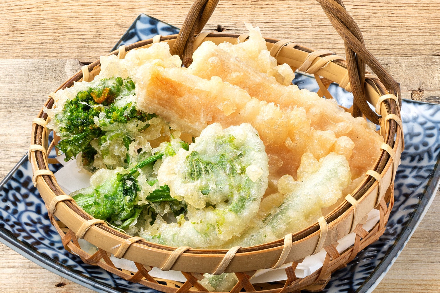 山の幸のイチオシは「山菜天布羅盛り」(650円)です。山菜は提携農家などから仕入れた「山うど」や「こごみ」など、雪解け間もない時期に一本一本丁寧に収穫したもの。新鮮な素材を板前が香ばしい天布羅に仕立て、春の味覚を最大限に引き立てます(※内容は日替わり)。