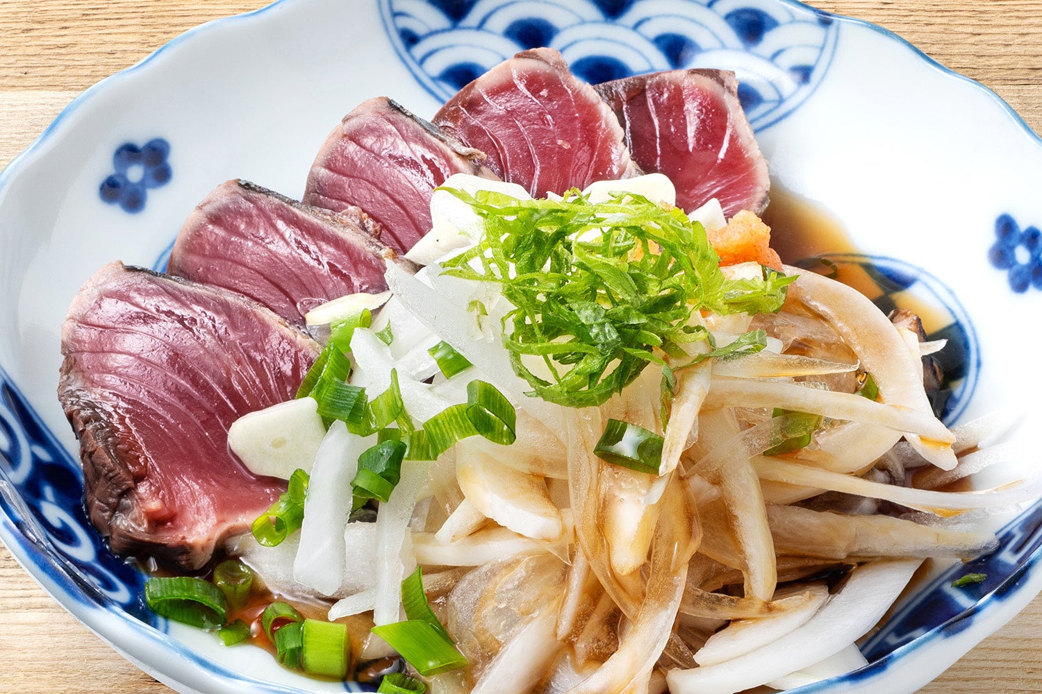春の到来を感じる3・4月の旬メニュー。海の幸のオススメは「初かつおと新玉ねぎのタタキぽん酢」(680円)です。この時期に日本近海で獲れるカツオは脂身よりも赤身が多く、みずみずしいサッパリとした味わいが楽しめます。グループ会社である豊洲市場の老舗仲卸「米川水産」(※)が厳選して仕入れた素材を使うので品質は折り紙付き。店舗で板前が捌き、一つひとつ丁寧に串打ちしてから皮を炙ります。シャキシャキで甘み豊かな新玉ねぎとあわせた香ばしいタタキは爽やかな風味で絶品です。