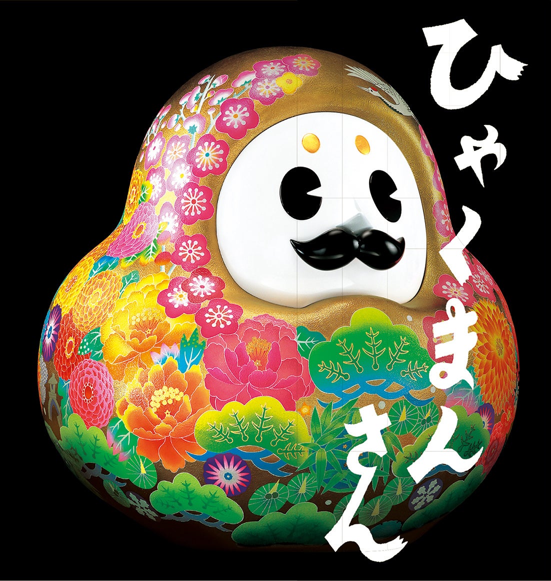 石川県観光PRマスコットキャラクター「ひゃくまんさん」は、石川県の郷土玩具であり、縁起物の「加賀八幡起上り」をモチーフに、石川の多彩な文化をギュッと凝縮し、百万石の豪華絢爛さをイメージさせるデザインで、北陸新幹線開業PRキャッチコピー「いしかわ百万石物語」を象徴するキャラクターとして作成されました。