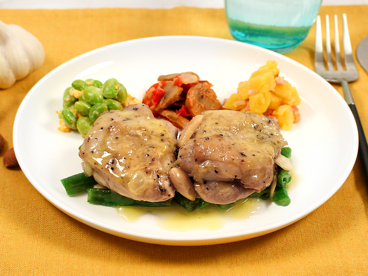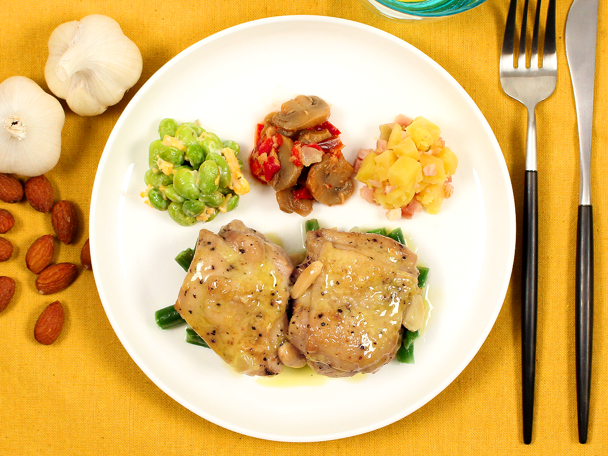 にんにくの風味とアーモンドのカリカリ感がたまらない!新感覚のガーリックバターチキンが登場しました。口の中で広がる濃厚なバターソースと、焦がし醤油オイルの味が食欲を掻き立てる一品です。